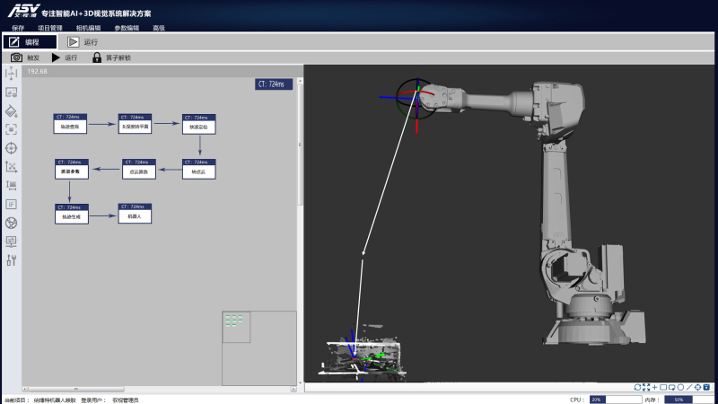 軟件適配ABB、安川、發(fā)那科、庫卡、UR等國外主流機(jī)器人,同時兼容埃斯頓、遨博、廣數(shù)、珞石等國內(nèi)機(jī)器人,可以全程控制機(jī)器人的動作流程,順利完成智能抓取、軌跡規(guī)劃、碰撞檢測等工作。