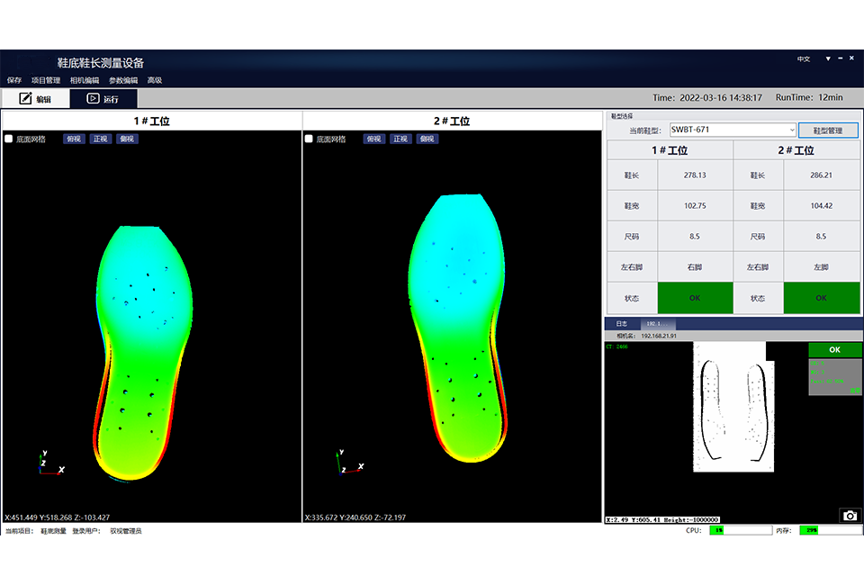 大底3D智能檢測系統(tǒng)基于線激光掃描3D相機(jī),搭載自主研發(fā)的3D視覺軟件,對(duì)大底進(jìn)行智能碼數(shù)識(shí)別和左右腳判斷。線激光掃描3D相機(jī)獲取深度圖后,通過3D視覺軟件進(jìn)行數(shù)據(jù)處理,給出大底的長寬高尺寸,然后判斷大底碼數(shù)和左右腳,對(duì)不在碼數(shù)要求尺寸范圍內(nèi)的大底進(jìn)行剔除。